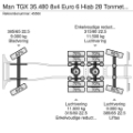 Mit Kran, Tempomat, Klimaanlage, Elektrische Fenster, Kühlschrank, Radio, Schiebedach, Werkzeugkasten, Differentialsperre, Antriebseite, ABS, EBS - Elektronische Bremssystem, Sonnenblende, Heizung, Standheizung, Liftbare Nachlaufachse